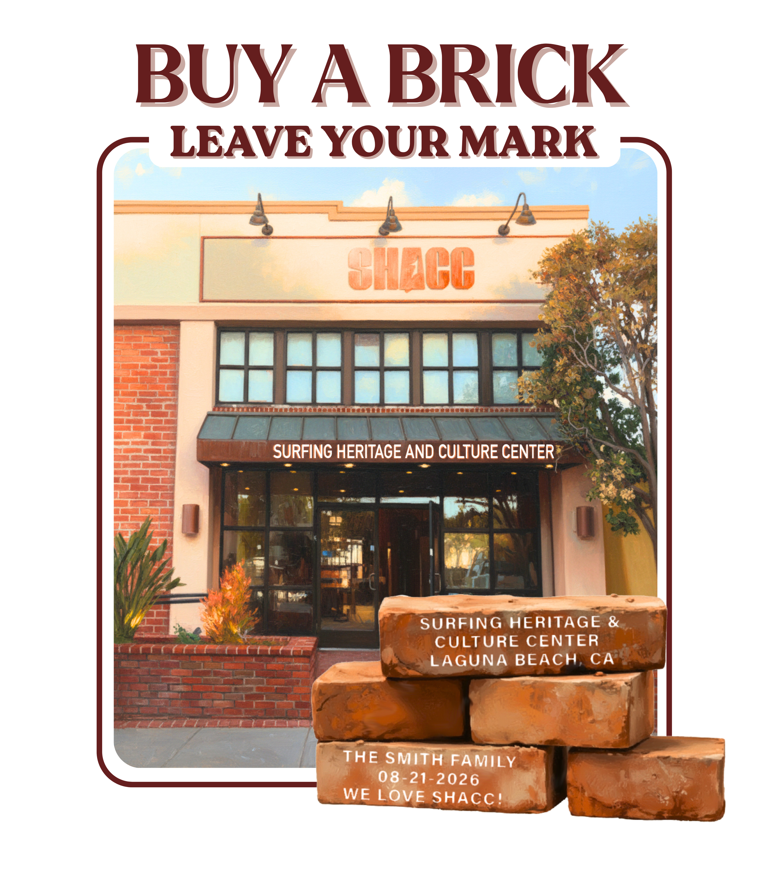 We want you to have a permanent spot at SHACC Laguna Beach! Engraved bricks will be personalized and installed throughout the Ocean Avenue entrance of the new Surfing Heritage and Culture Center. This high traffic location is a prime spot for visitors from all over the world to see who is helping preserve surfing’s heritage. Honor a loved one, celebrate a milestone, or simply leave your mark on an important cause.